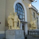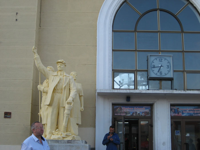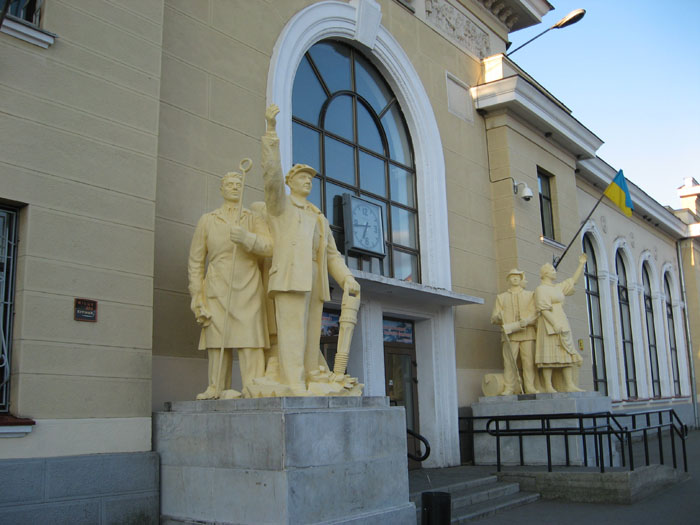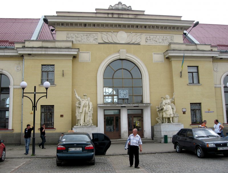 Шість фігур, які стоять по обидва боки входу залізничного вокзалу в Мукачеві, нещодавно пофарбували у колір слонової кістки. Доти були білими. Скульптури встановили у радянський період на честь людей праці. Впізнаваними є сталевар, лісоруб, хлібороб, колгоспниця. У мережі натрапили на історичне чорно-біле фото, на якому фігури темні, над входом почеплено портрет Леніна.