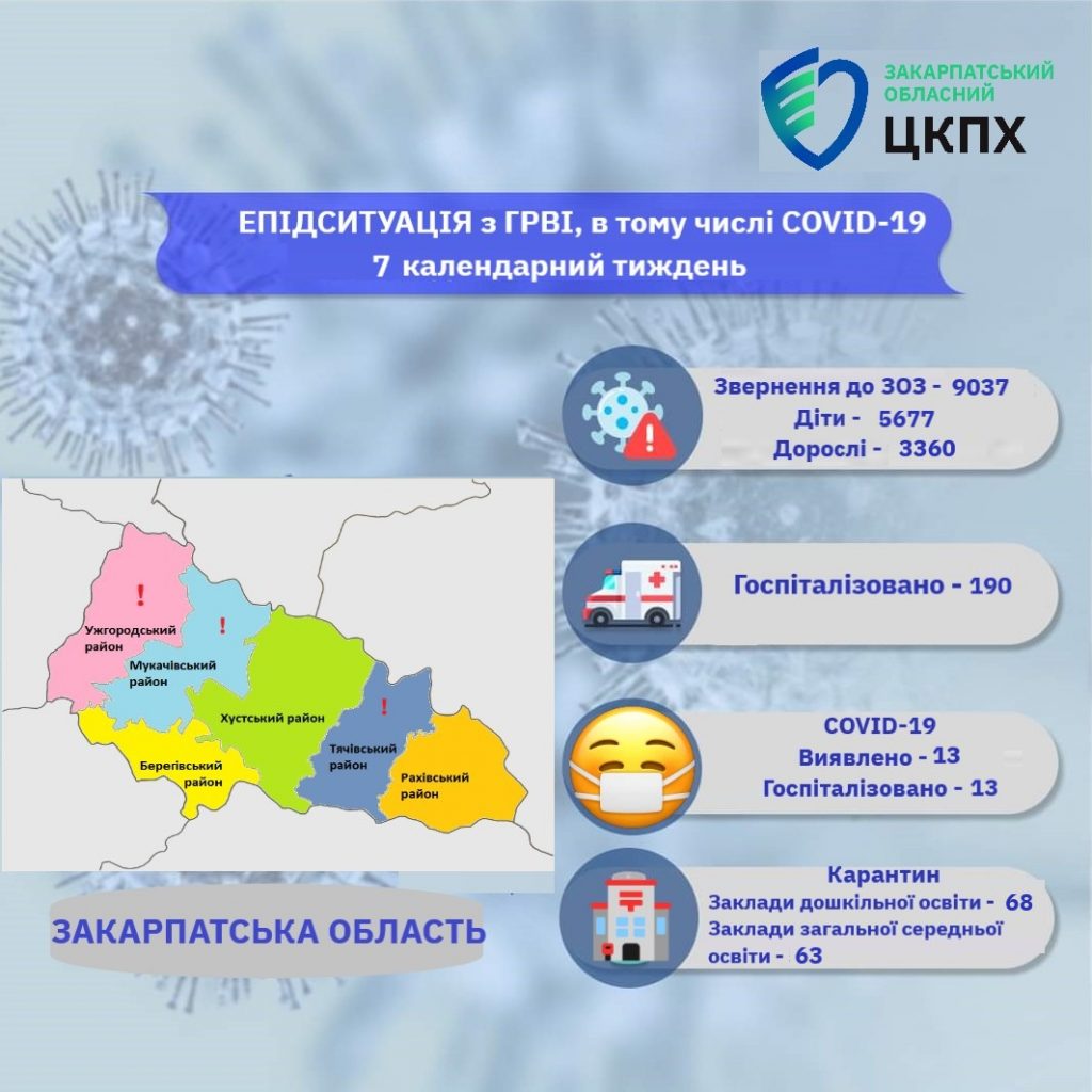 Серед хворих з ГРВІ підтверджено 13 випадків захворювання на коронавірусну інфекцію COVID-19, що становить 0,1%, випадки, зареєстровані серед дорослого населення. Кількість хворих зменшилася на 35,0 % у порівнянні з попереднім тижнем (13 проти 20 випадків).