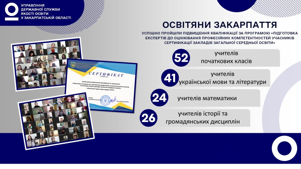 143 освітяни Закарпаття успішно пройшли навчання за програмою підготовки експертів до оцінювання професійних компетентностей учасників сертифікації і вже цієї весни можуть бути залучені до роботи у ролі експертів Державної служби якості освіти України.