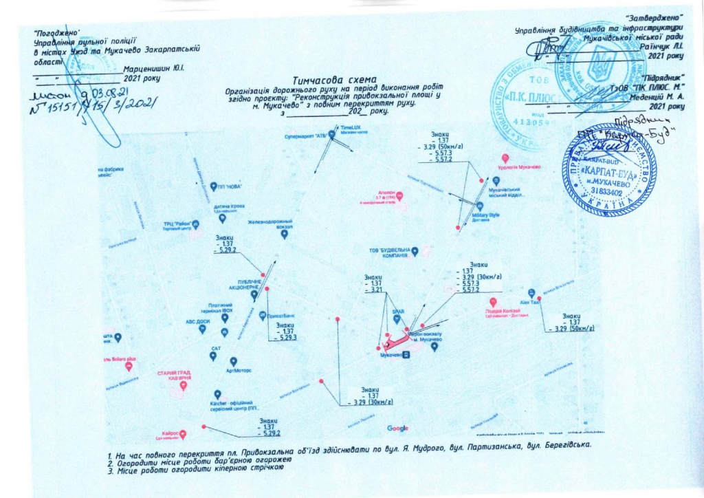 У зв’язку з продовженням робіт по об’єкту: “Реконструкція привокзальної площі у місті Мукачево”, з 10 квітня до завершення робіт буде перекрито проїзд на площу зі сторони вулиць Ярослава Мудрого, Вокзальна та Лучкая Михайла.