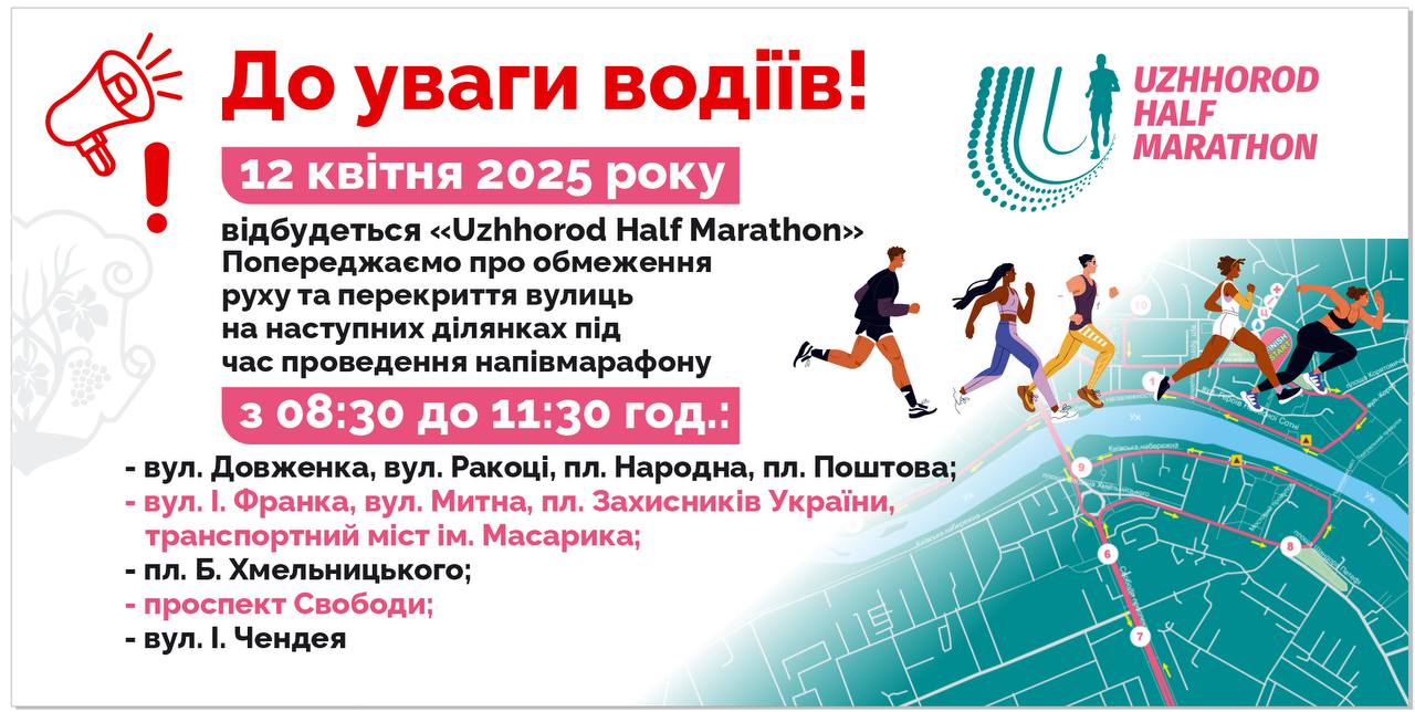 Ужгородців інформують про тимчасове обмеження руху в Ужгороді 12 квітня у зв’язку з проведенням благодійного Uzhhorod Half Marathon 2025.