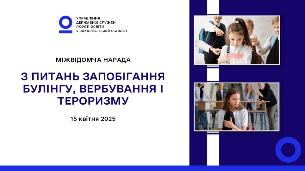 Сьогодні освітній простір має бути не лише якісним, а й безпечним. Саме тому 15 квітня 2025 року в онлайн-форматі відбулася міжвідомча робоча нарада, присвячена питанням запобігання булінгу, вербування та тероризму серед дітей і молоді. Захід об’єднав представників різних служб, керівників органів управління освітою територіальних громад та керівництво закладів освіти Закарпаття.