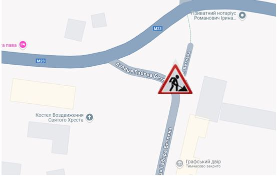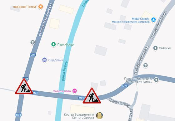з 12:00 до 14:00 – від перехрестя вул. Мукачівська та площі Ференца Ракоці ІІ до Римо-католицької церкви (ремонт тротуару мосту через канал Верке).