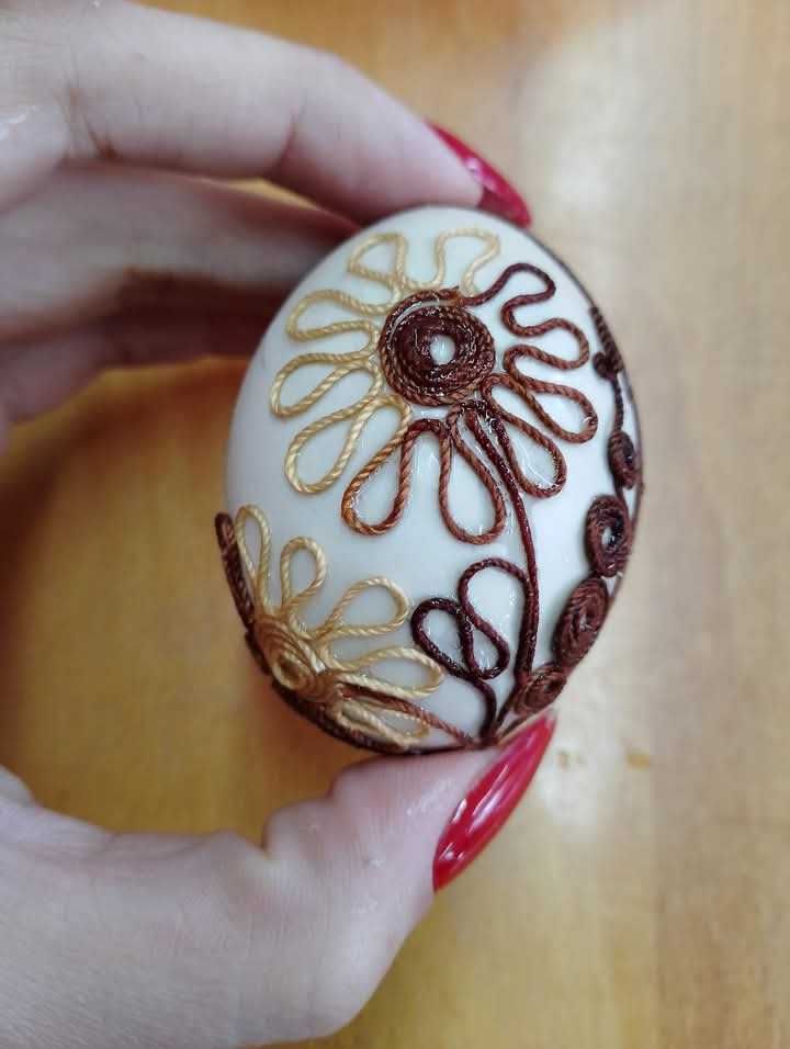 «Писанка з ниток робиться довго. Перш за все потрібно продути яйце. Воно може бути будь-яким. Але я надаю перевагу качачим. Можуть бути і гусячі, які міцніші і більші за курячі. Потім яйце треба обмотати ниткою, змоченою клеєм. Використовую ПВА. Але найважче чекати, коли яйце підсохне. А висихає досить довго. Цей процес займає точно годину. Нитки люблю використовувати меланжеві, з переходом кольорів. Якщо мова про тканинні писанки, то вирізаються чотири шматки матерії, якими обклеюється яйце», – наголошує вона.