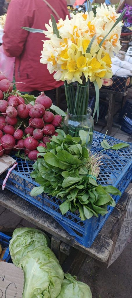 Пані Валентина – пенсіонерка з Хуста. Продає як зеленину з городу – зелену цибулю, редиску, щавель, так і букети нарцисів.