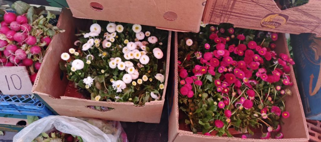 У Хусті перед ринком майже місяць уже як кипить торгівля весняними рослинами. Продають різні квіти у невеликих пластикових горщиках. У основному привозять їх аграрії із Берегівщини (фактично – Виноградівщина), де рослини вирощують у теплицях і займаються цим професійно – цілими сім’ями.