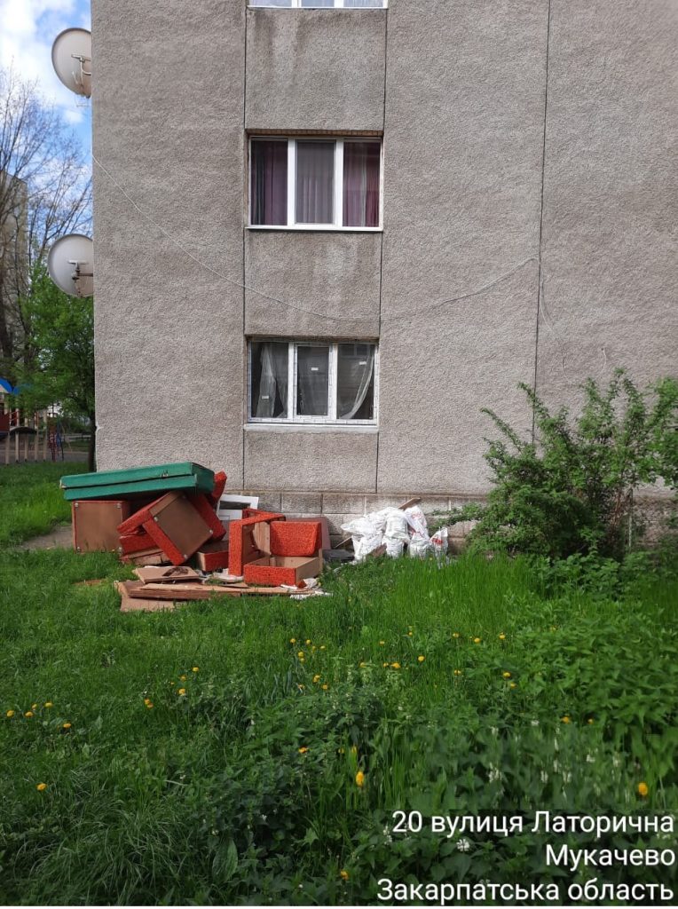 Забороняється складування побутових відходів на вулицях, тротуарах, зелених зонах, насадженнях на схилах озер, річок та інших водойм, а також в місцях масового відпочинку міста та інших об’єктах благоустрою, що зазначається в пункті 13.1.2. Правил благоустрою міста Мукачево. Так, в ході патрулювання мікрорайонів міста, інспектором відділу контролю за станом благоустрою зафіксовано складування побутових відходів на зеленій зоні мешканцями багатоповерхового будинку.