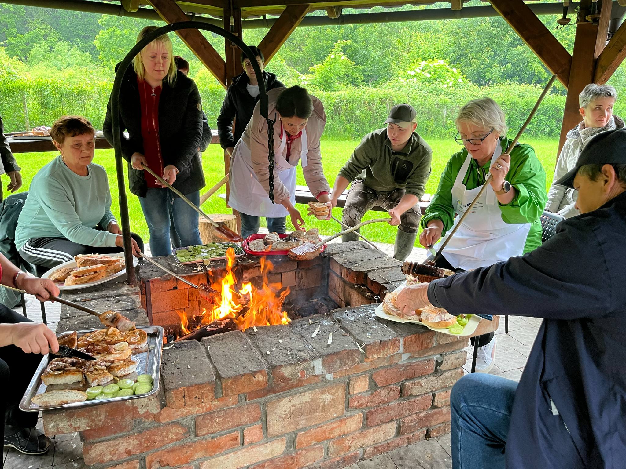 Незважаючи на дощову погоду, атмосфера заходу була теплою та надзвичайно дружньою. Учасники розпалили багаття та розпочали день з традиційного смаження сала – одного з найвпізнаваніших елементів місцевої кухні. Ароматне сало не лише потішило смакові рецептори, але й стало символом спільності та гостинності.