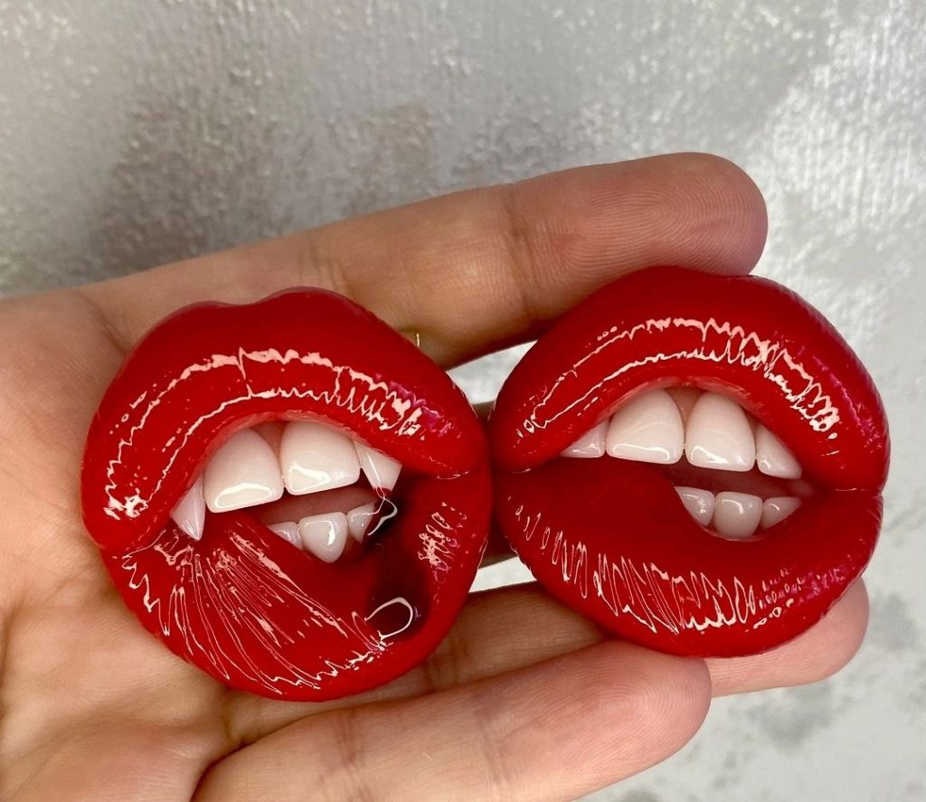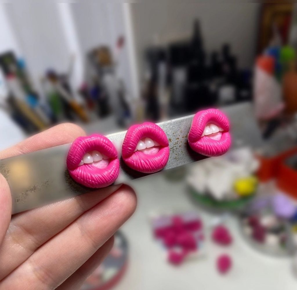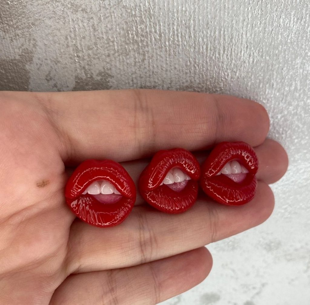 «Як випічкою, так і виготовленням аксесуарів я займаюся вдома. Маю велику простору кухню та невеличку кімнату-майстерню. Торти – це моє основне заняття. Раніше було модно обтягувати тортики марципаном і виготовляти з нього різні фігурки, тож ліпкою захопилася ще тоді, років 17 тому. Але це були їстівні вироби. Я розуміла, що в мене непогано виходить і давно поставила собі за мету опанувати ліплення з полімерної глини, мріяла робити прикраси для себе та для доньки. У вільний час почала проходити усілякі майстер-класи, закупила матеріали і почала пробувати. Спочатку ліпила сувеніри та посуд. Згодом перейшла на сережки. Це були простенькі квіти, ягідки та геометричні фігури. Але одного разу донька прийшла додому з великими губами, збільшила їх. Я нічого не маю проти, коли таку процедуру проходять чужі мені люди, але власну доньку сприйняти з такими «тромфами» досить довго не могла. Тож захотіла просто «приколотися» з неї і зробила їй кулон та сережки у вигляді відкритого роту з зубами та величезними губами. Навіть думала, що Леся образиться. Але ні, їй вироби дуже сподобались і наступного дня навіть одягнула їх до подруги. Я не розраховувала на такий успіх. До вечора усі знайомі доньки почали мене просити зробити для них щось подібне. Ось із нього моменту й почалася робота над «губатими» прикрасами», – поділися думками з «Карпатським об’єктивом» умілиця.