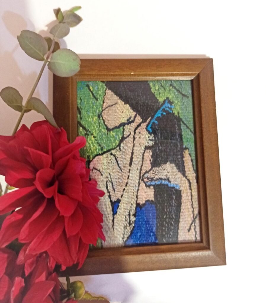 «Мар’яні я виткала її улюблені лілії. Але це не натюрморт. Квіти ростуть на відкритій місцевості. На задньому тлі – закохана пара. Саме так, як хотіла донька», – наголошує умілиця.