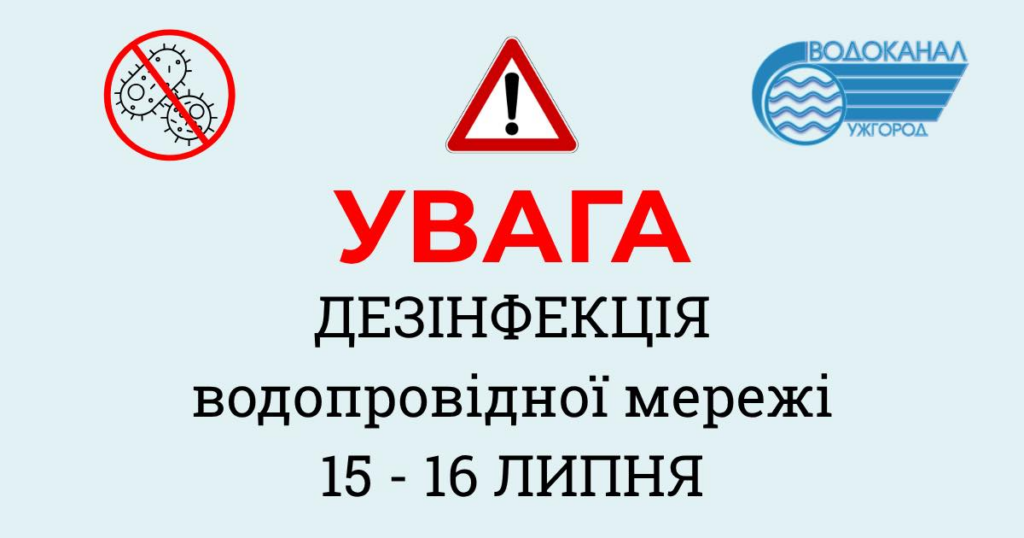 КП «Водоканал м. Ужгород» попереджає містян про проведення планової дезінфекції розподільчої водопровідної мережі. Роботи заплановані на ніч із 15 на 16 липня — з 00:00 до 05:00. У цей період вода з водозаборів НФС-1, НФС-2, НФС-3 та насосної станції підземного водозабору «Минай» подаватиметься з підвищеною дозою залишкового хлору — до 1 мг/дм³ на виході.