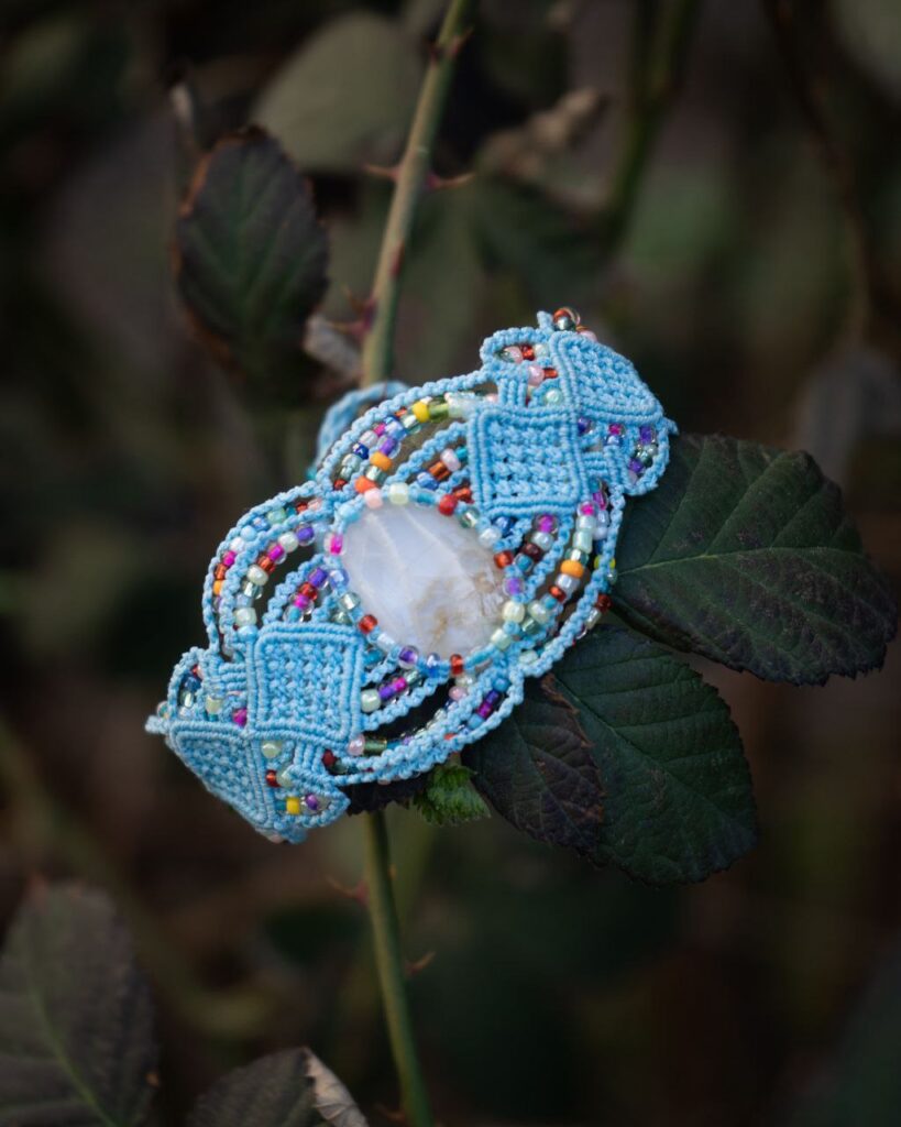«У роботі використовую поліестерові нитки. Вони стійкі до сонячного світла, не вигорають. Але вчитись можна з будь-якими. Головне освоїти ази в’язання вузлів, відтак згодом уже можна буде підключати фантазію і вигадувати щось своє. Кожна робота – це мільйони маленьких вузликів. Доповнюю прикраси японським бісером, цікавими природними камінцями, кристалами та усілякими вставками ручної роботи», – зазначає пані Любов.