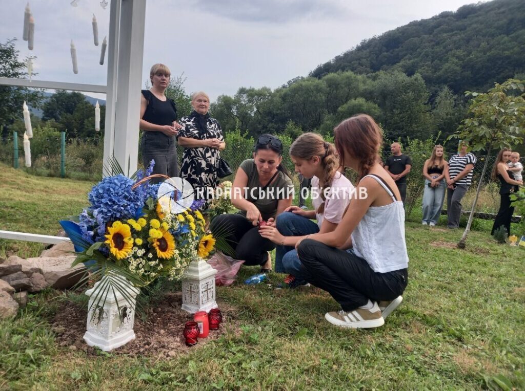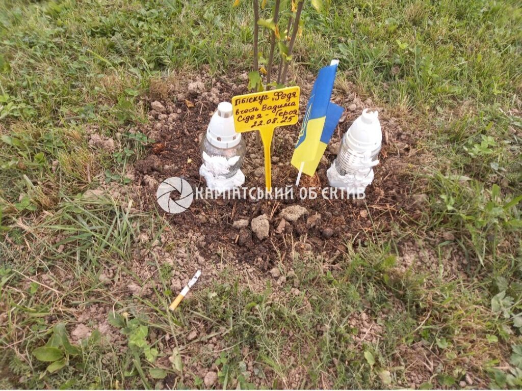Надія Сідей втратила на цій клятій війні сина Вадима. На локації разом з чоловіком висадила кущ гібіскуса 22 серпня. Біля рослини горить лампадка, у землю встромлений прапорець, тліє цигарка.