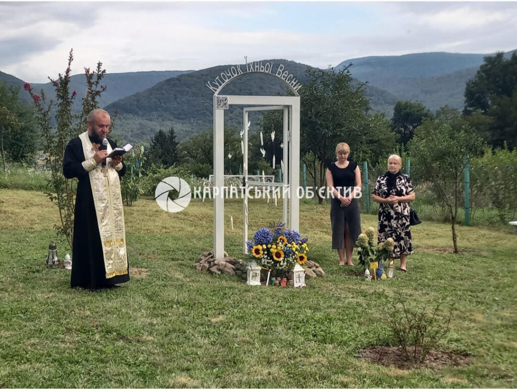 Куточок їхньої весни закладений навесні цьогоріч. Тут встановлені символічні двері з фігурками білих голубів. Засновниця Сонячної алейки гібіскусів Любов Крижановська розповіла кореспондентці «Карпатського об’єктива», що родичі загиблих уже висадили 13 кущів різних рослин, зокрема є кущі гібіскусів, туї, бузку, гортензії.