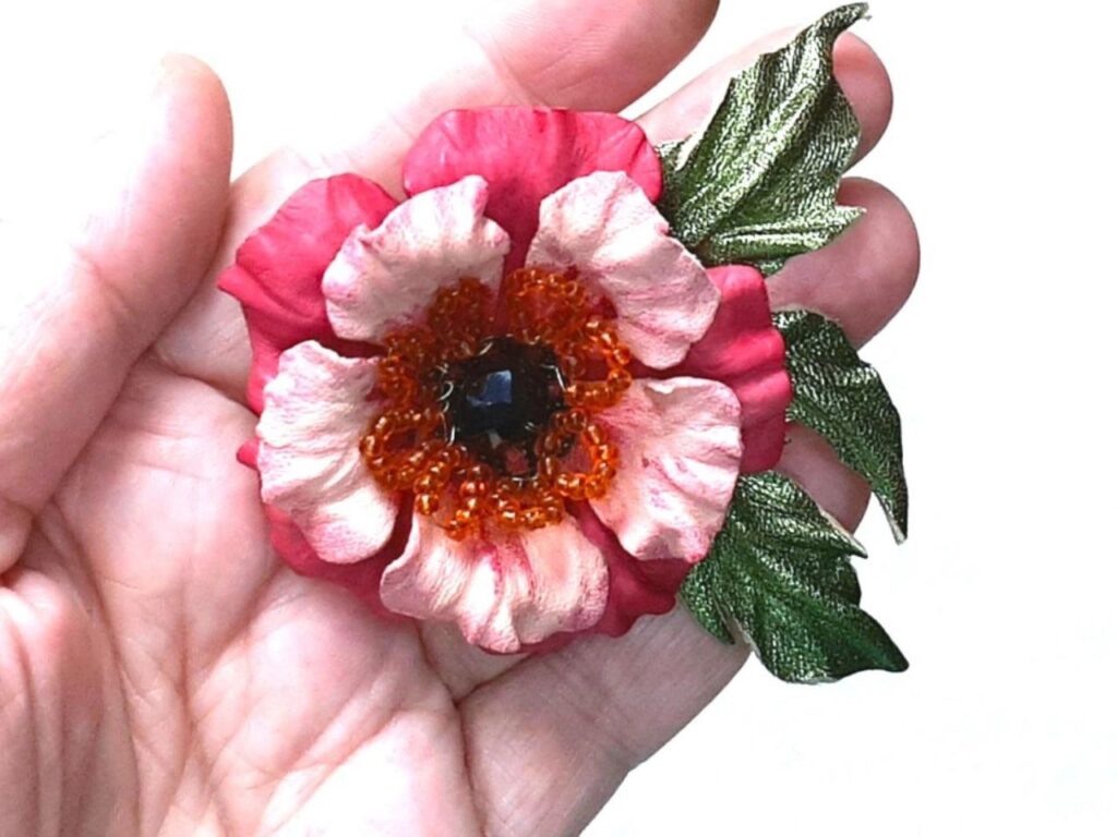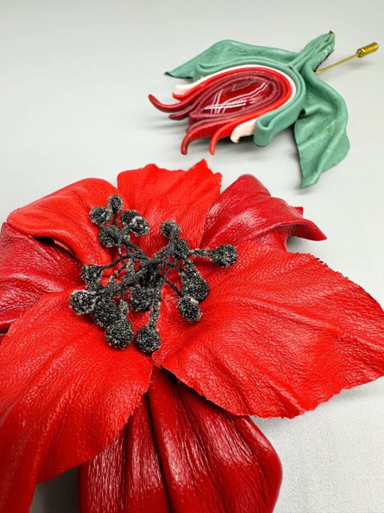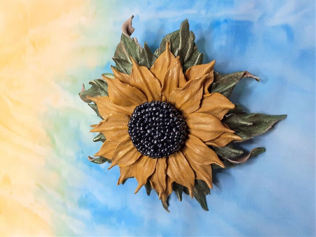 «Для роботи потрібна тверда поверхня, спеціальні зубила, які нагадують гребінець, якщо мова про пошиття вручну, молоточок, затискачі, голки та багато іншого. Сам матеріал або купую через мережу, або іду в секонд-хенд і вибираю якісні, але недорогі готові шкіряні речі. Майстер-класів бажано пройти декілька у різних майстрів, аби опанувати різні техніки. Шити шкіру може далеко не кожна машинка. Крім того, треба знати, як робити викрійки, як поєднувати деталі між собою та багато іншого. Зупинила вибір на флористичних мотивах, бо дуже люблю квіти. Але створити можна і в етностилі, і щось фантастичне. Аби виріб був акуратним, не можна поспішати. Тож у мене створення однієї прикраси може зайняти декілька днів. Форнітуру купую через спеціальні сайти. Усе інше – уже майстерність, уява та наполегливість», – наголошує вона.