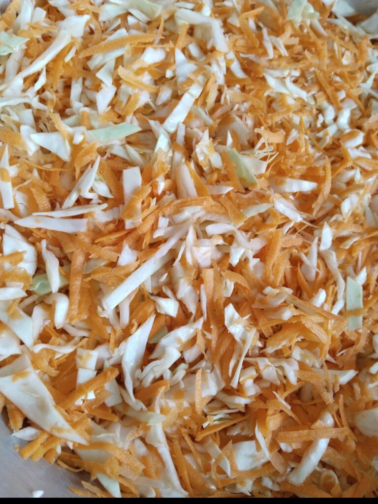 «Капусту шинкую, моркву натираю на терці, як для корейської. Змішую їх у каструлі. Додаю грам 30 солі і перемішую. Розсіл роблю з 1,5 літра води. Додаю в окріп 2 столові ложки солі і залишаю охолонути. Відтак кладу капусту в банку, заливаю розсолом так, щоб він покрив капусту. Якщо подобається, можна буде потім додати трохи часнику або цибулі, перцю. Банки накриваю марлею і залишаю на заскленому балконі у темному місці на три дні. Температура має бути кімнатною. Весь цей час періодично проколюю капусту ножем, аби випустила гази. Після закінчення бродіння, коли перестане утворюватися піна, складаю капусту в чисту банку і поміщаю у холодильник. Після цього її можна їсти», – ділиться секретами ґаздиня.
