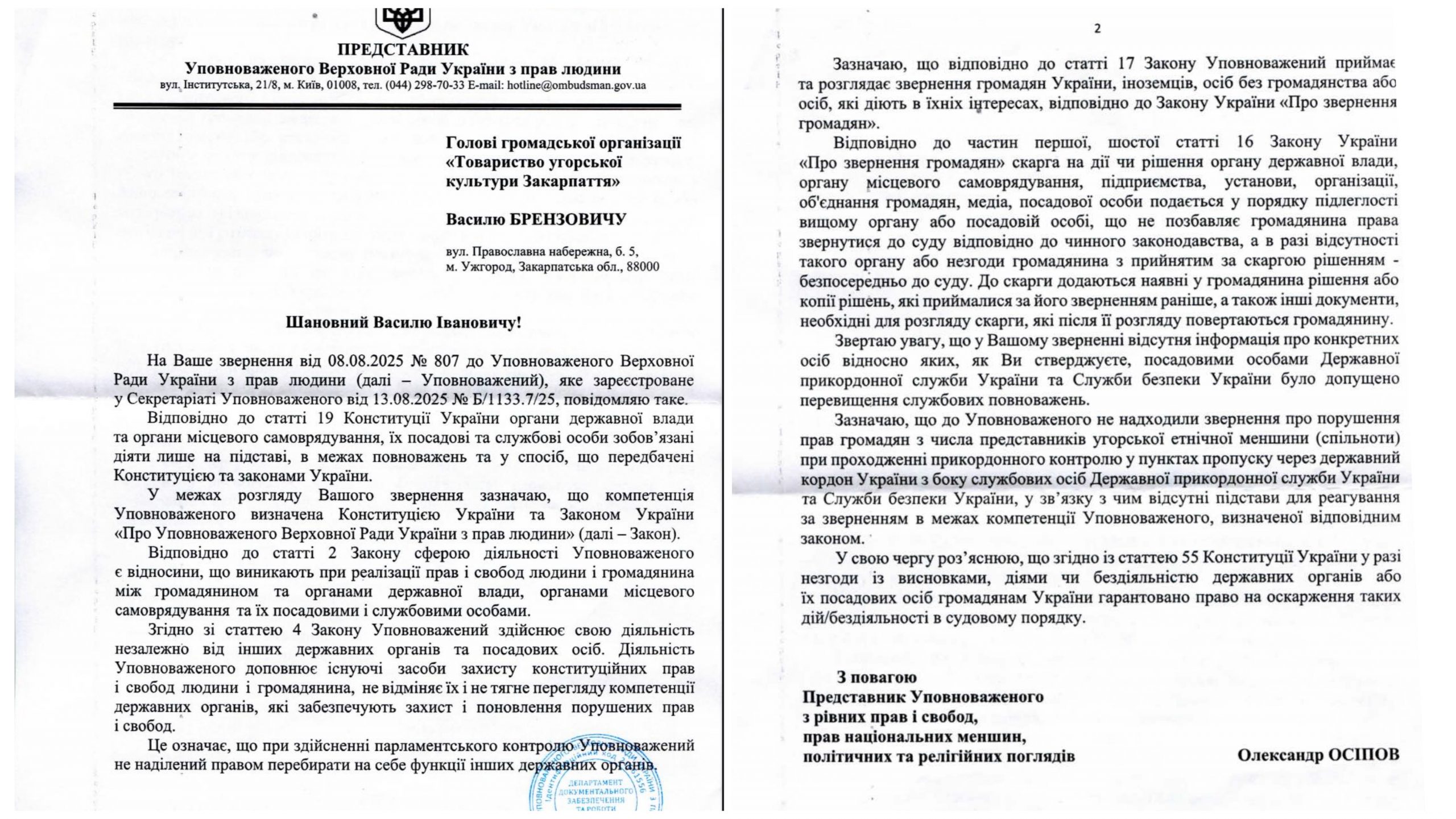 Уповноважений Верховної Ради України з прав людини відповів на запит щодо утисків закарпатських угорців на кордоні