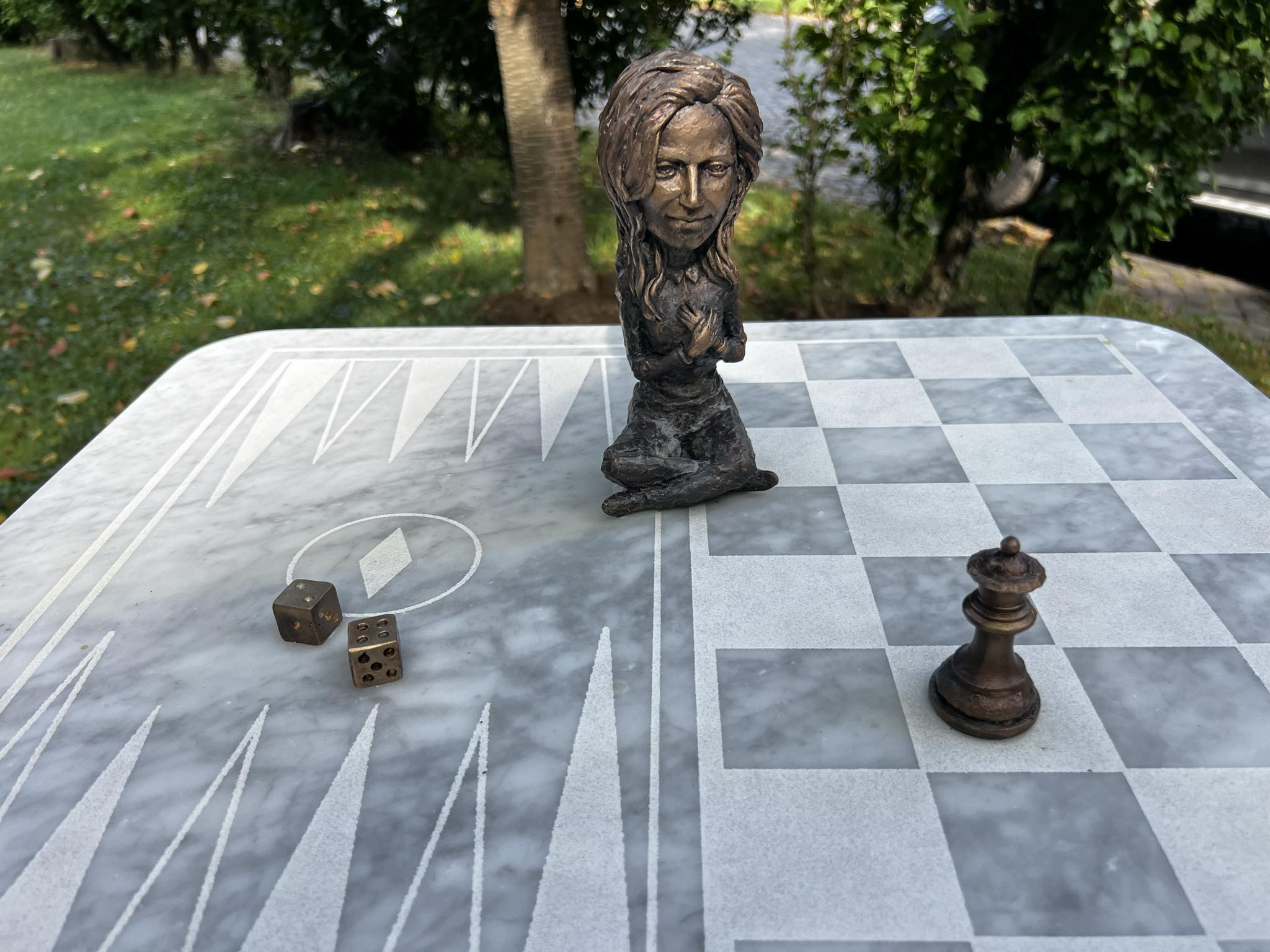 На оригінальній шаховій дошці, яка поділена на шахове поле з королевою (символізує те що Юдіт Полгар багаторазовий чемпіон світу з шахів) та нардове поле з кубиками (символізує древню гру – українська федерація якої знаходиться в Ужгороді). На шаховій дошці медитує в чудовому сквері князя Лаборця, чемпіонка світу з шахів, що має закарпатські коріння.