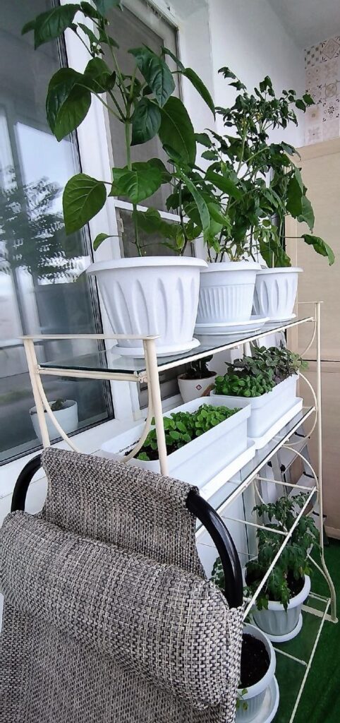 Працювати над мінігосподарством пані Емілія почала ще шість років тому. Спочатку разом з чоловіком засклила обидва балкони. Потім стала закуповувати ґрунт, горщики, шукати в мережі корисні поради.