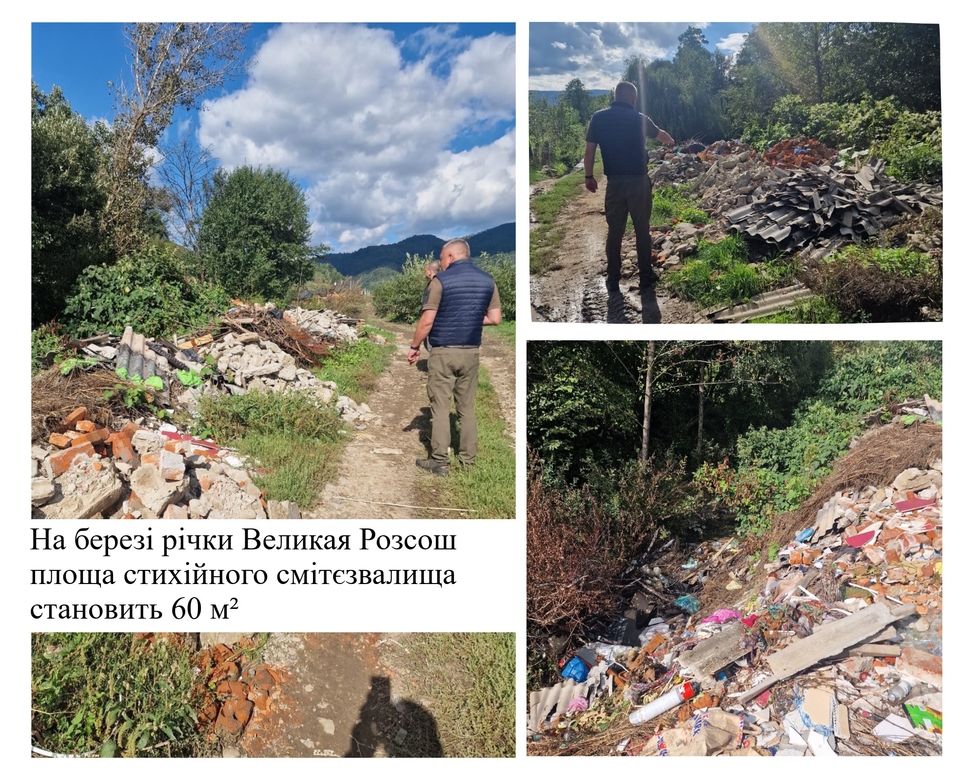 - на березі річки Велика Розсош (48.5112944, 23.2128145) площа сміттєзвалища становить 60 м², обʼєм твердих побутових відходів — 36 куб. м;