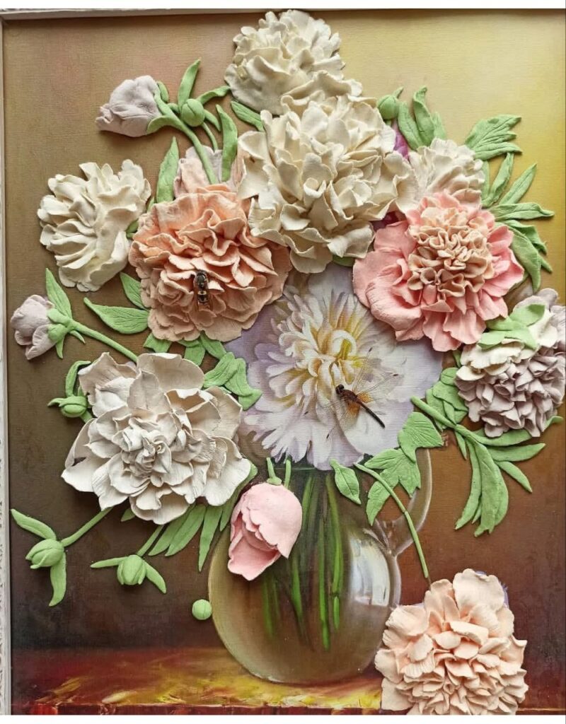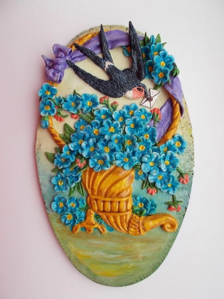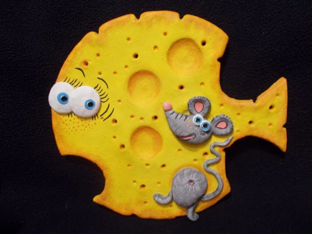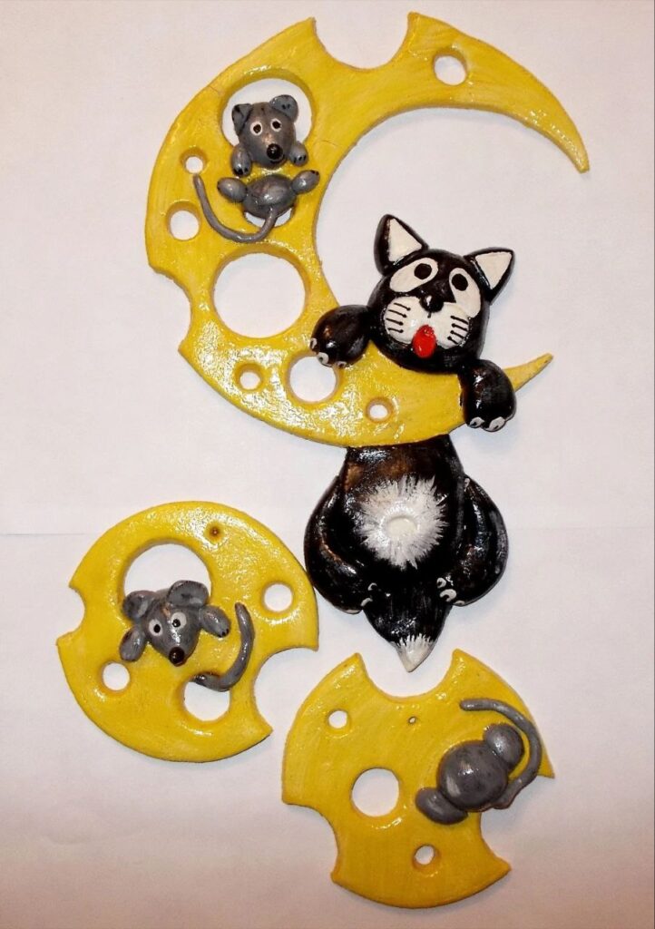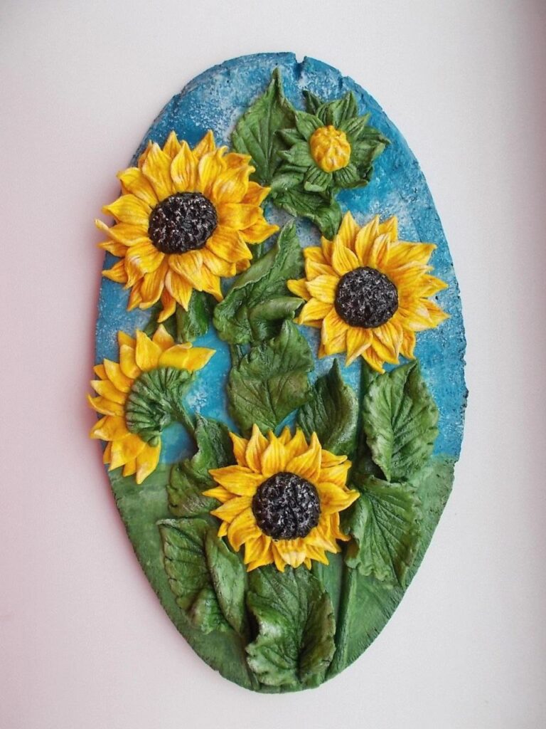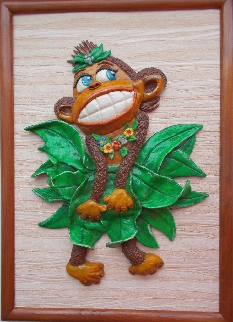 «Клей ПВА та шпаклівка – чудова суміш для роботи. Так само дешево у використанні і практично у роботі. Моїм першим виробом зі шпаклівки був кіт на місяці, а зі солоного тіста – ведмедик. Зараз у моєму доробку декілька сотень робіт. Найбільше казкових героїв, бо переважно вони для сина. Найбільш цікавим виробом можу назвати світильник для дитячої кімнаті у вигляді зайчика, який замість морквинки тримає у лапках лампочку. Найважчою для себе роботою вважаю панно у вигляді дівчини з кавовим горнятком. Робила його для сестри. Декілька разів переробляла, бо не подобалось. Виріб великий – метр на 60 сантиметрів, один із найбільших у моїй колекції», – наголошує умілиця.