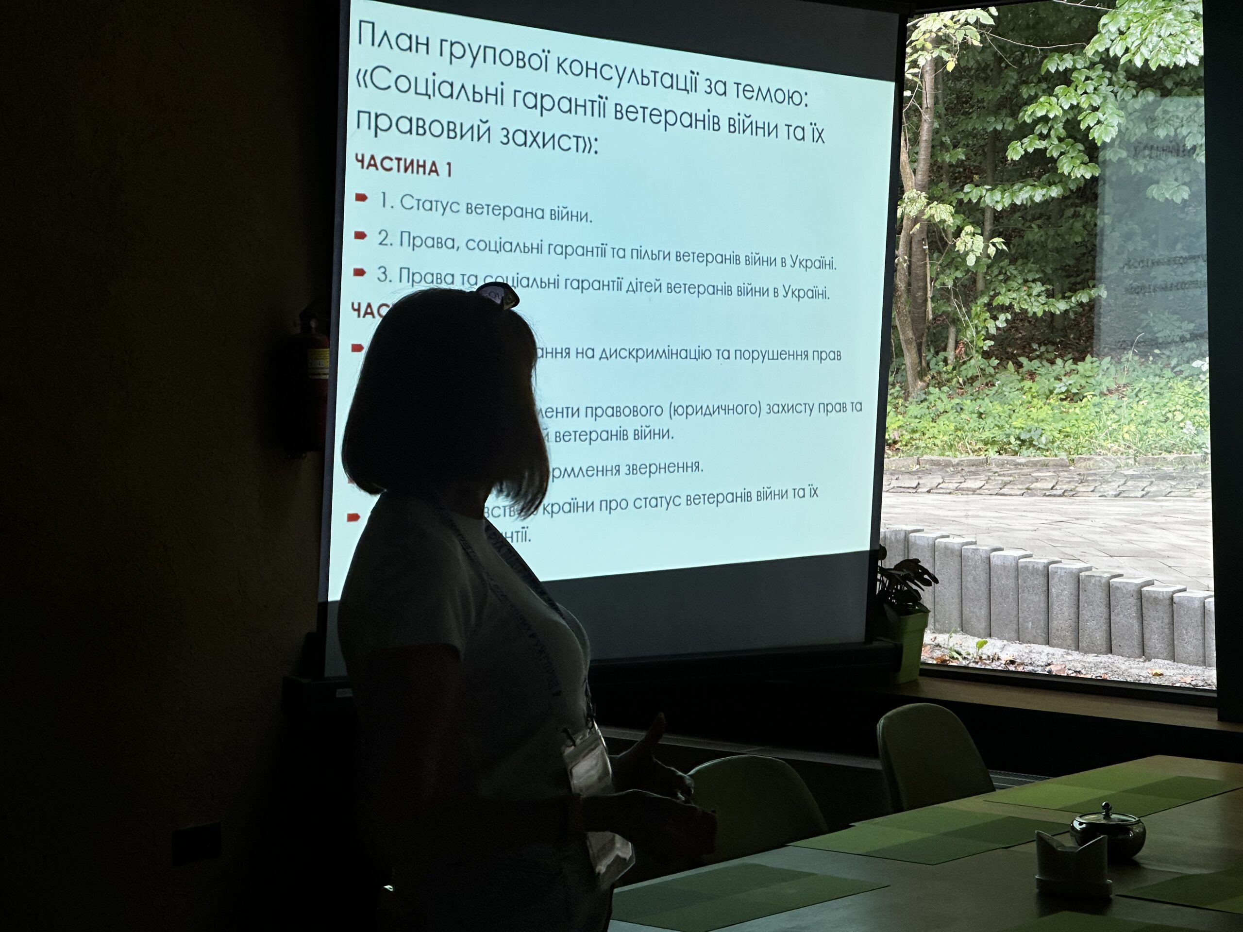 – За результатами опитування учасників ми зосередилися на темі «Соціальні гарантії ветеранів війни та їх правовий захист». Це великий блок, який ми поділили на кілька частин. Ми говорили про статус ветерана війни, пільги та соціальні гарантії як для них самих, так і для їхніх дітей. Обговорювали, як діяти у випадках дискримінації, які інструменти юридичного захисту доступні, як правильно оформляти звернення.