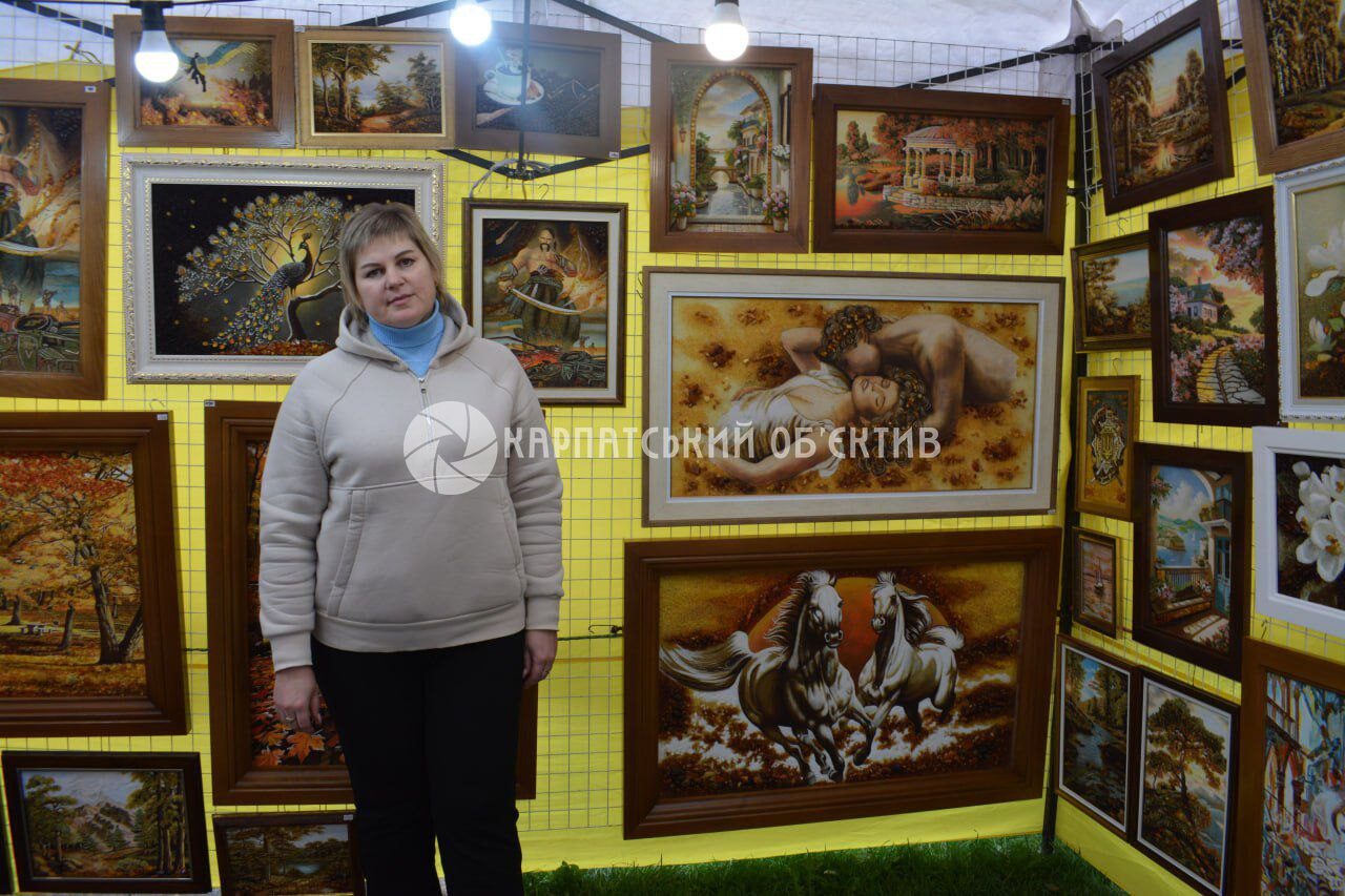 Алла Разкевич із Рівненщини про ярмарок у Хусті дізналася два тижні тому. Вона – професійна художниця і привезла картини, оздоблені бурштином.