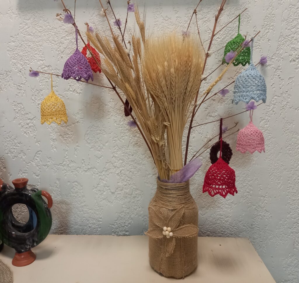 – Ці вироби я зв’язала гачком до прийдешніх свят. Дай Боже, щасливо дочекатися Різдва та Нового року в мирній Україні, – каже Наталія Сенченко. – Щоб дзвіночки тримали форму, накрохмалила їх у спеціальному розчині. Удома маю такі ж, правда, білі та значно більші, які виготовляла для виставки народних умільців «Миколай шукає таланти». Рукоділлям займаюся з дитинства, любов до цієї справи прищепила мама.