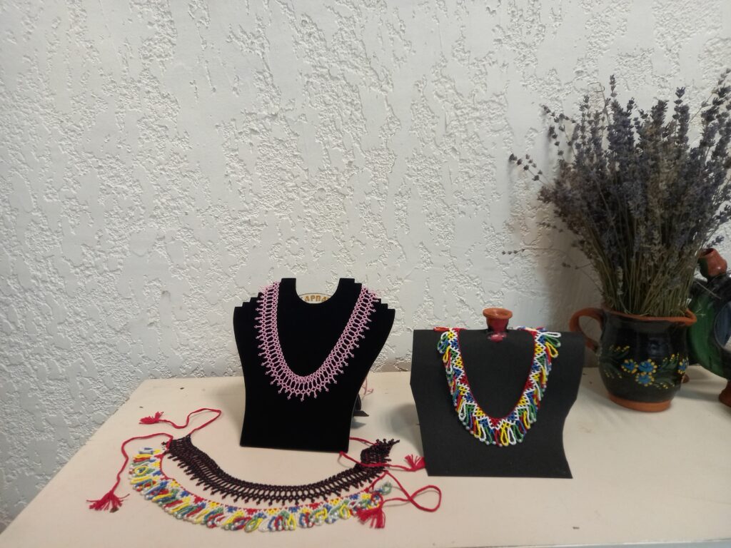 У 2023 році запропонували роботу в музеї. Вона мені припала до душі. На одному з майстер-класів, який проводила молода дівчина Аня, ми робили силянки з бісеру. Спочатку мені не вдавалося, а потім, коли вже була осінь, похолодало, я затопила піч у музеї і мене та силянка так надихнула, що я її того ж дня закінчила. Навчитися цього нескладно, було би бажання і терпіння. Вона знаходиться на видному місці, і нашим відвідувачам на її прикладі розповідаємо про традиційні українські жіночі прикраси. Приємно, що багатьом це припадає до душі й вони продовжують цікавитися закарпатським побутом та народним вбранням і прикрасами. Я вважаю, що наш музей робить важливу справу в збереженні та примноженні традицій рідного краю. Наразі в моїй колекції тих силянок уже з десяток, три подарувала сестрі Олені, а також обдарувала всіх племінниць. Ці вироби з бісеру намагаюся стилізувати на сучасний лад, часто одягаю їх не тільки на свята, а й у будні. Дуже пасують до моїх власноруч вишитих сорочок, – Наталія поправляє прикрасу лавандового кольору на темному фоні, виконану за зразком силянки 30–40-х років ХХ століття з Великоберезнянщини.