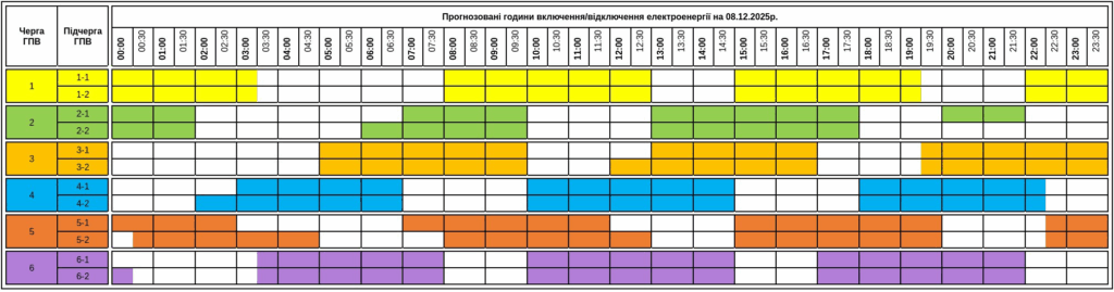 ПрАТ «Закарпаттяобленерго» повідомляє про оприлюднення графіка погодинних включень/відключень електроенергії на понеділок, 8 грудня 2025 року.