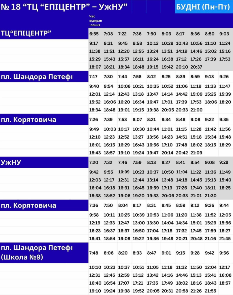 Комунальне підприємство «Ужгородський муніципальний транспорт» повідомило про зміни у роботі маршруту №18 «Епіцентр – УжНУ» (через площі Шандора Петефі та Корятовича).