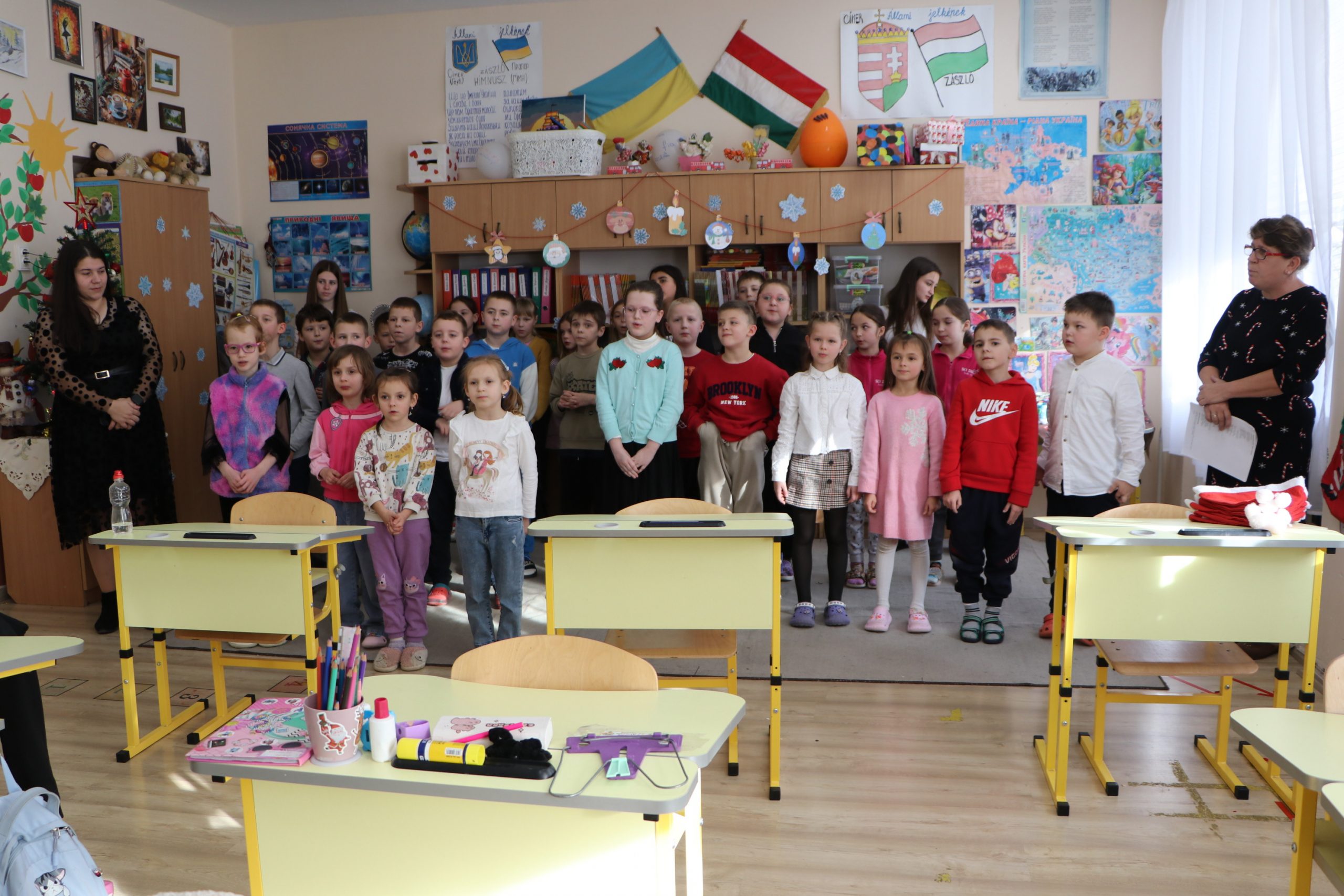 Наступною зупинкою Ференца Паппа під час його різдвяного туру була 1-ша початкова школа в Солотвині. Гість привіз подарунки учням 1–4-х класів, які навчаються угорською мовою. Тут загалом 45 дітей навчаються угорською мовою, серед них є й один внутрішній біженець. Діма Лесуков приїхав з Миколаєва разом із родиною, ходить до угорського класу перший рік. Хлопчику подобається школа та угорська мова, він уже знає багато слів, а вдома вчить угорської мови членів своєї родини, які вже вміють читати угорською.