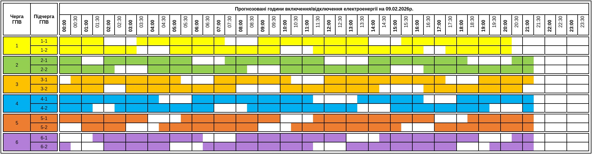 Енергетики опублікували прогнозований графік погодинних включень та відключень електроенергії на 9 лютого 2026 року.