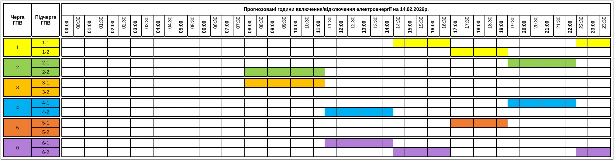 Енергетики опублікували прогнозований графік погодинних включень та відключень електроенергії на 14 лютого 2026 року.