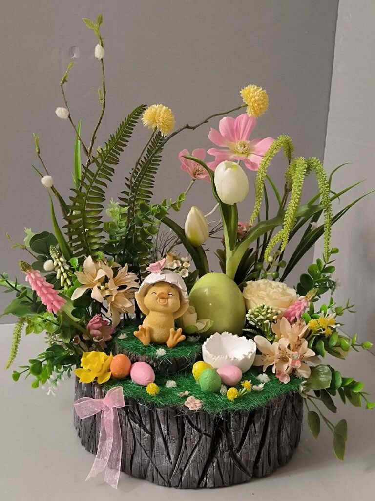 «Це було так ніжно, так по-весняному! Гілки ніби ожили. Тоді я зрозуміла, що можу зробити з цього щось більше, – пригадує майстриня. – Почала шукати інформацію в інтернеті, пройшла декілька онлайн майстер-класів і почала експериментувати. Відтоді щовесни у моєму домі «розквітає» одразу кілька дерев. Одні – у пастельних тонах, інші – яскравіші, з акцентами на жовтий чи рожевий. У роботі поєдную текстильні квіти з гіпсовими фігурками, додаю пінопластові яйця, обтягнуті тканиною, або писанки інших майстринь, прикрашаю композиції дрібними деталями з дерева чи пластику. Я люблю мікс матеріалів. Головне, щоб усе мало гармонійний вигляд. Навіть пластик може виглядати дуже ніжно, якщо правильно його подати», – впевнена умілиця.
