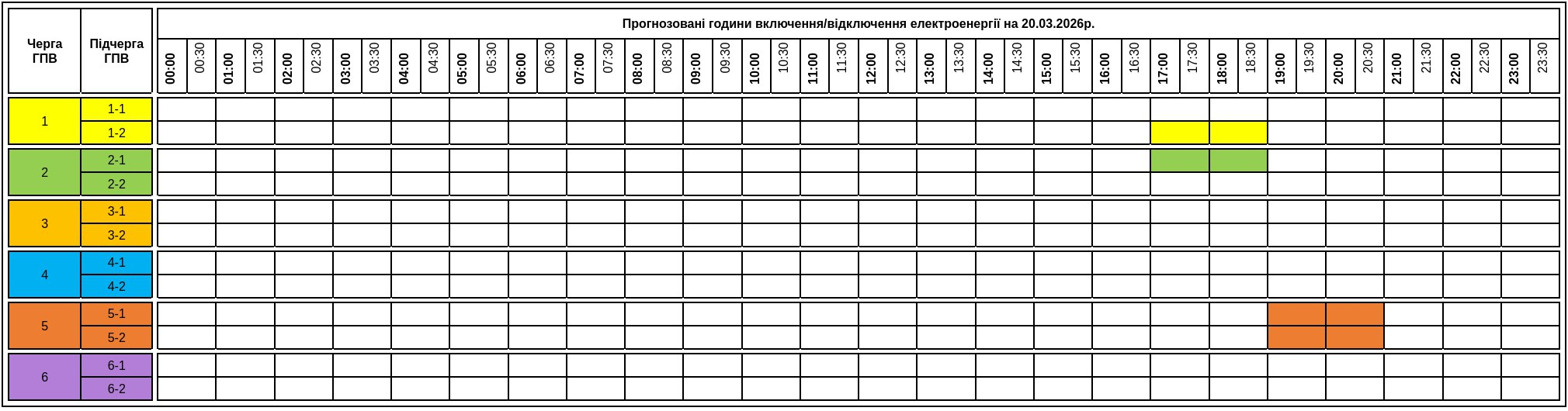 Енергетики опублікували прогнозований графік погодинних включень та відключень електроенергії на 20 березня 2026 року.