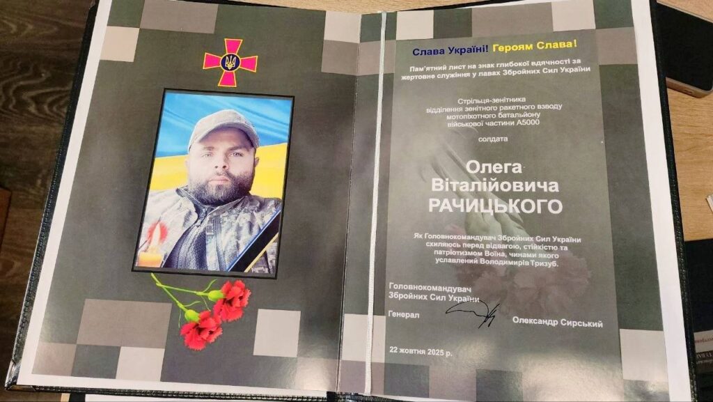 Громада Великого Березного зустріла захисника, воїна Рачицького Олега (06.12.1994 -22.10.2025 р.) навколішки, з квітами та прапорами.