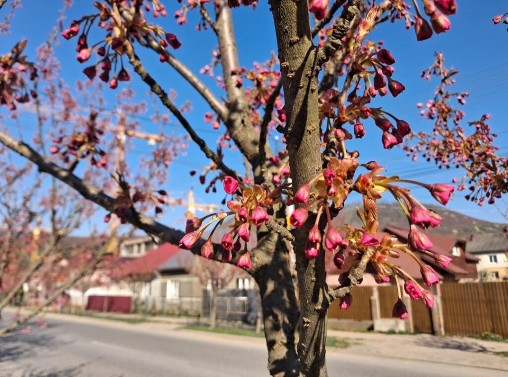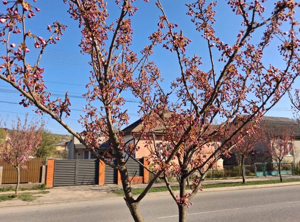 Перші фото перечинських сакур я зробила три тижні тому, коли на деревах з’явилися перші квіти і були готові до квітування. Кожен другий-третій день дивилася на них з надією, що вони проявлять свою стійкість та характер, як українські захисники, і розквітнуть. Але наразі рожевого дива не сталося: ніжні пелюстки так і не вибухнули – натомість вони замліли, або як ще кажуть на Закарпатті, задерев’яніли, закаменіли.