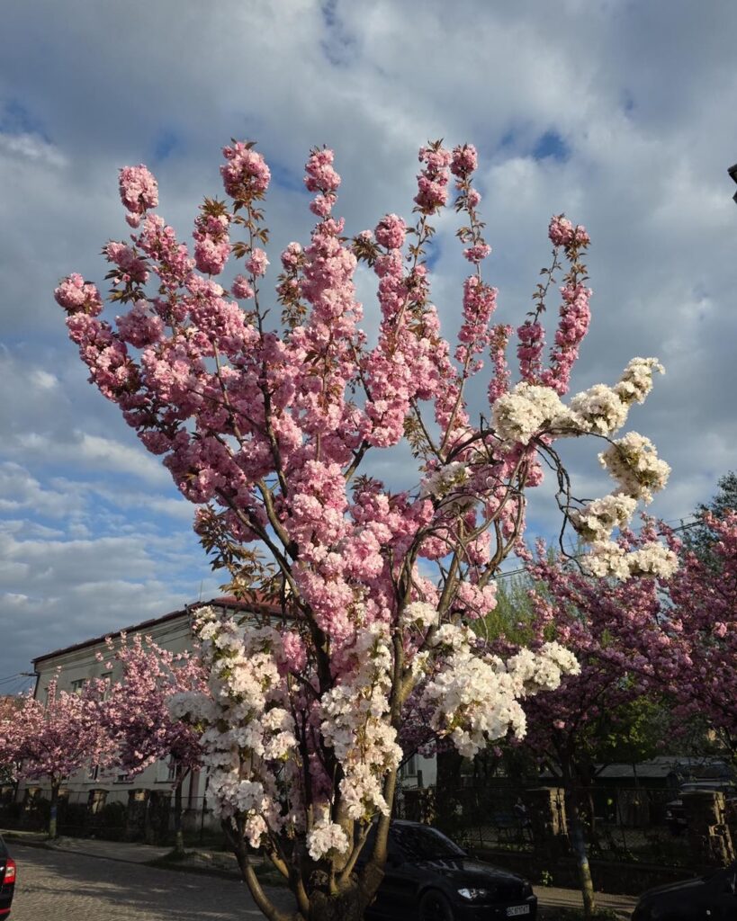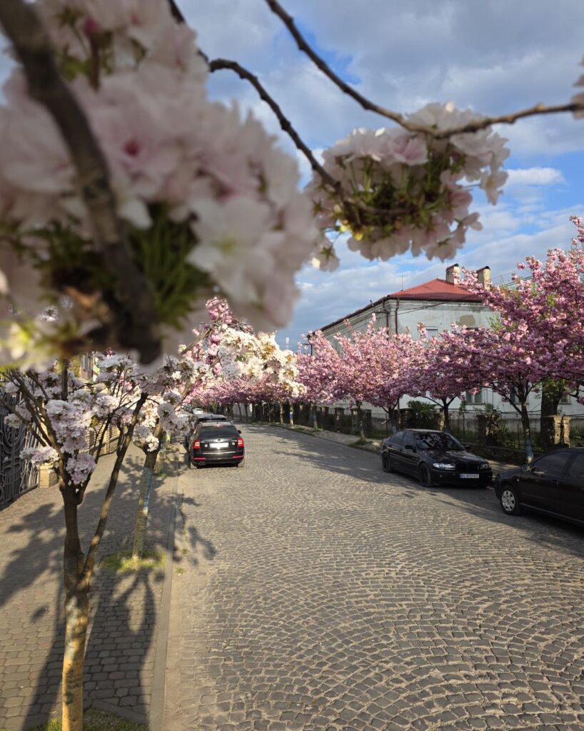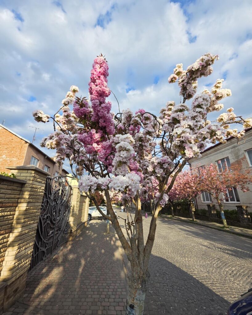 У Мукачеві, поряд із традиційним рожевим цвітінням сакур, можна побачити бінарну рожево-білу сакуру.