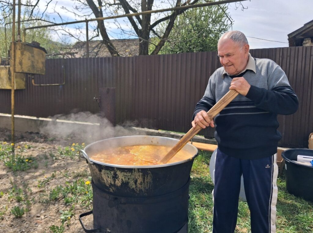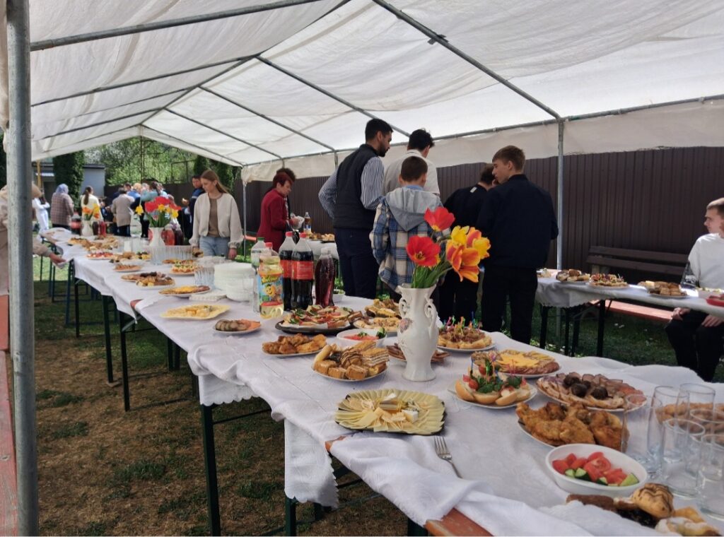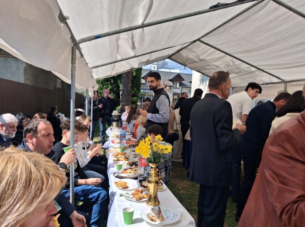 Згідно із закарпатською традицією, кожне свято завершується гостиною. У церковному житті ця трапеза називається «агапа» – святкове частування. На щедрому столі були смачні наїдки і напої: відбивні, м’ясні та сирні тарілки, бутерброди, різноманітні салати, домашні тістечка. Серед напоїв – чай, кава, солодка та мінеральна вода. Столітрований казан боґрачу приготували чоловіки на подвір’ї церкви. Смачна та ситна страва додала фізичної сили. А така радісна подія у світлий післявеликодний період об’єднала людей та церковних діячів Мукачівської ГКЄ, наповнила серця світлом та любов’ю, вірою та надією у завтрашній мирний день.