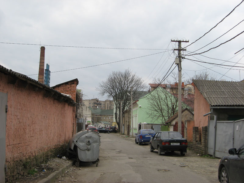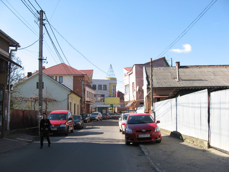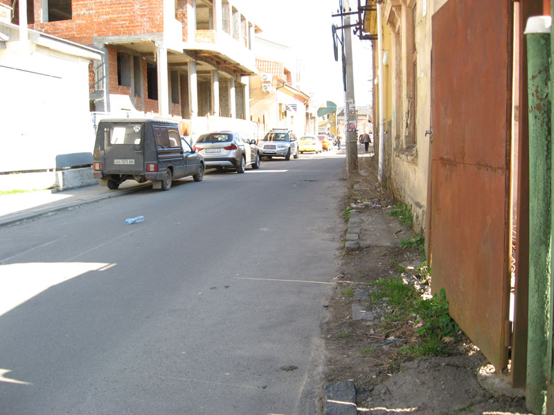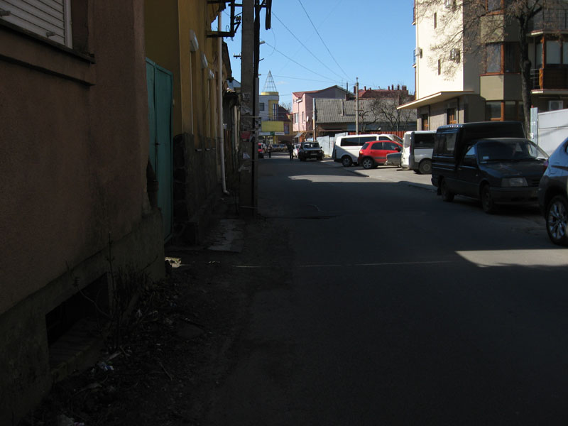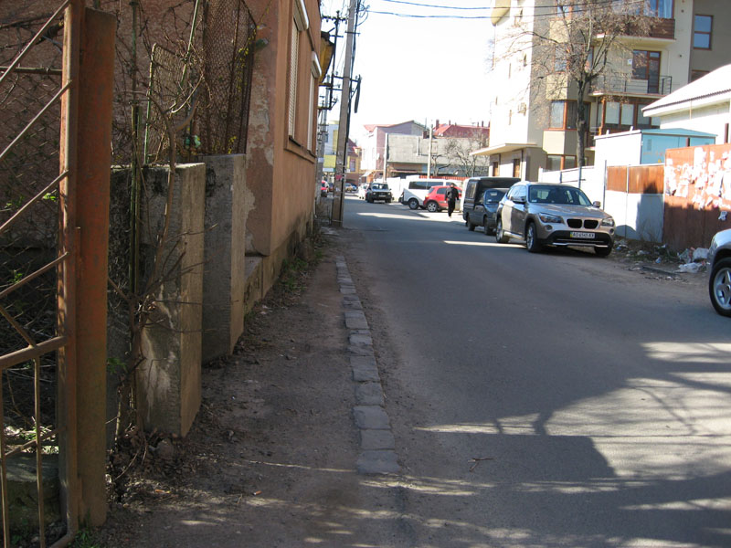 Мамі з дитячим візком навіть не варто туди йти. Ідучи вулицею, бачу старі будинки, що ледве купи тримаються, і нові багатоповерхівки. На декількох об’єкти тривають будівельні роботи. На старих – таблички з назвами і номерами встановлені ще у далекі радянські часи. На новобудовах – сучасні. У багатьох місцях нема тротуару, або по ньому зовсім пішоходи не ходять, бо дуже вузький чи понівечений внаслідок природніх умов, а прямують проїжджою частиною. На цій вулиці завжди багато транспортних засобів – якщо не їздять, то припарковані рядами на дорозі чи тротуарі. Ніхто не думає про пішохода.